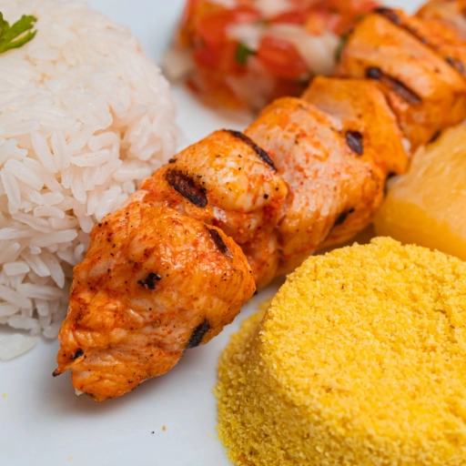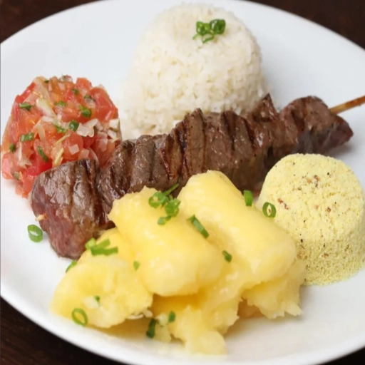 2 espetinhos, Arroz ou Baião, Farofa, Macaxeira e Vinagrete